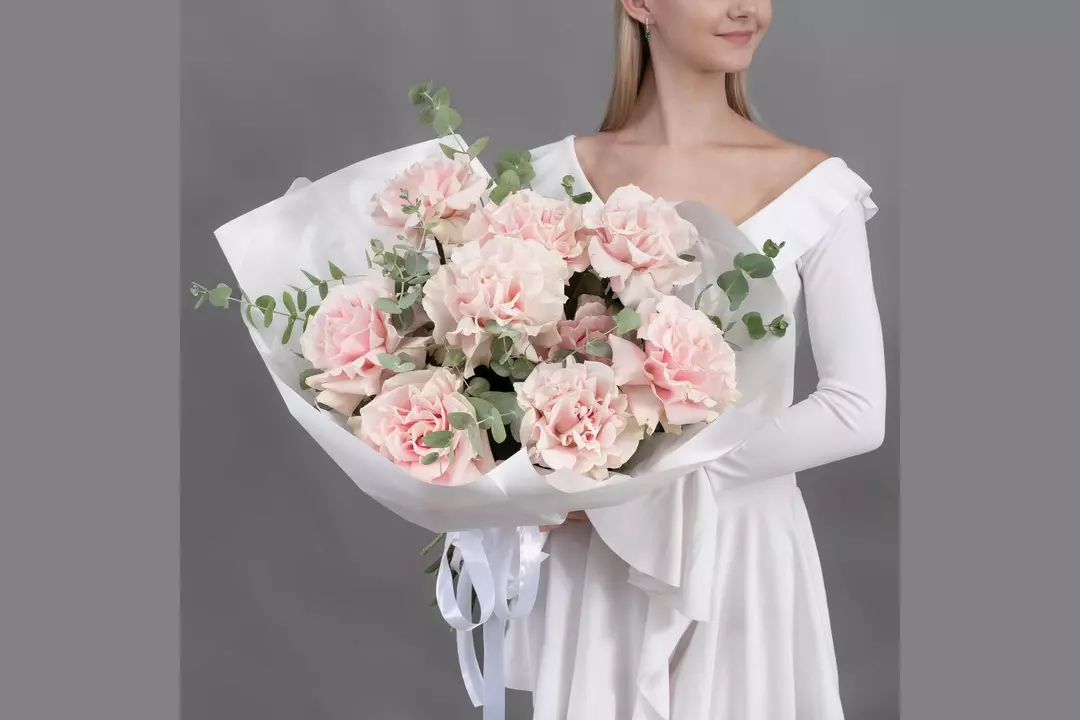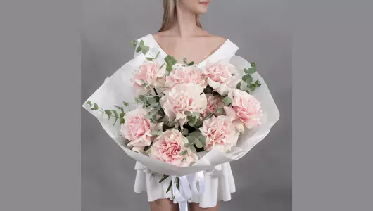 Состав Эвкалипт - 4 шт. Упаковка дизайнерская - 6 шт. Французская роза - 9 шт. Размер Ширина - 36 см Высота - 55 см Букет из 9 французских розовых роз с эвкалиптом в красивой упаковке — это элегантная композиция, сочетающая нежность роз и свежесть зелени. Французские розы отличаются пышными бутонами и изысканной формой, а эвкалипт добавляет букету объём и лёгкий аромат.