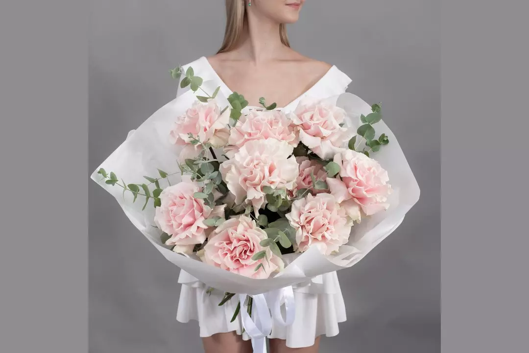 Букет из 9 французских, розовых роз с эвкалиптом в красивой упаковке FMART by flowwow
