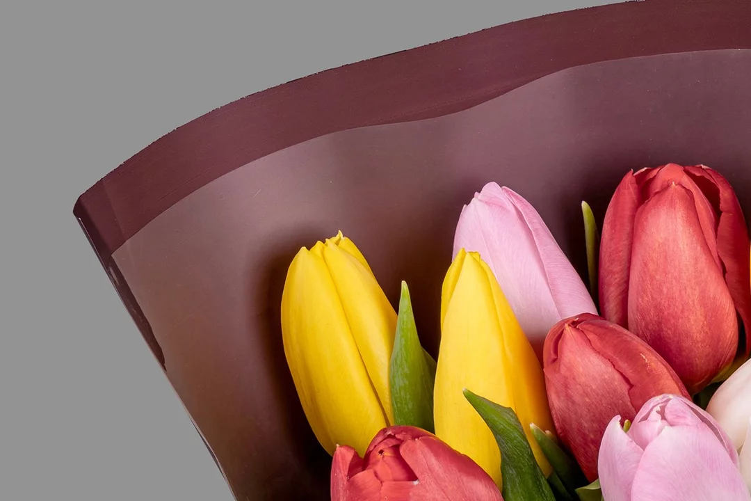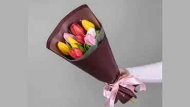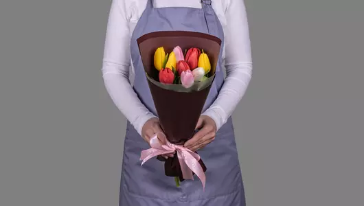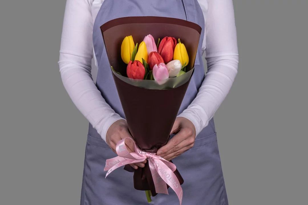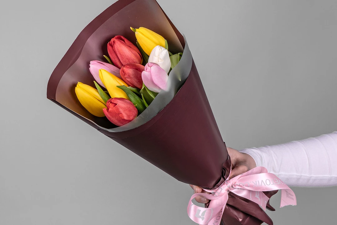Букет из 9 тюльпанов микс стандарт в оформлении