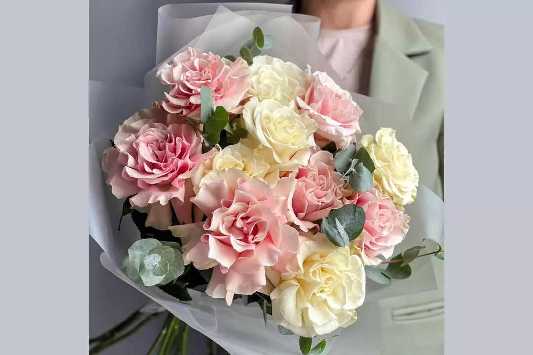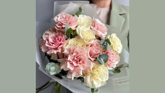 Букет из белых и розовых Французских роз подойдёт для любого повода. Этот букет состоит из самых свежих и красивых цветов, такой подарок обязательно оценит получатель! Состав букета: Роза Французская - 11 шт. Эвкалипт - 2 шт. Упаковка дизайнерская - 1 шт. Размеры: Ширина - 35 см Высота - 50 см