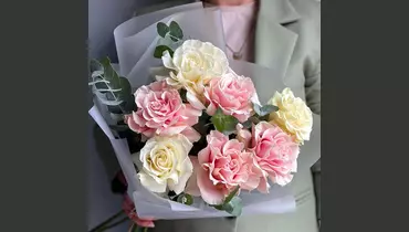 Букет из Французских роз белых и розовых с Эвкалиптом 7 шт #202 FMART by flowwow