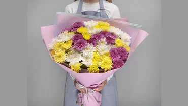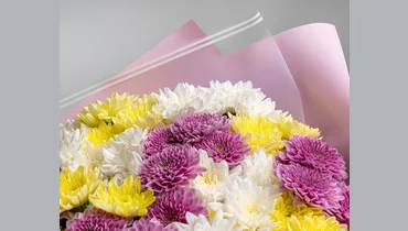 Состав: хризантема кустовая 15 шт., пленка 2 шт., лента 1 шт.