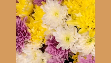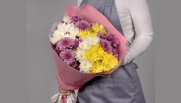 Состав: хризантема кустовая 7 шт., пленка 1,5 шт., лента 1 шт.