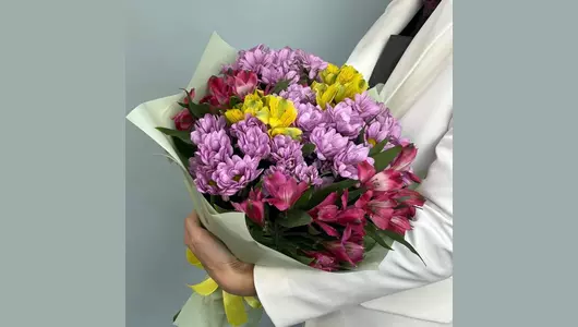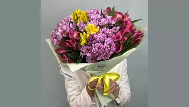 Яркий букет будет дарить Вам тепло и радость. Букетик, как лучики предпраздничного вдохновения порадует Вас своей яркостью! Разноцветные хризантемы и альстромерии будут долго радовать получателя своей стойкостью и неприхотливостью.