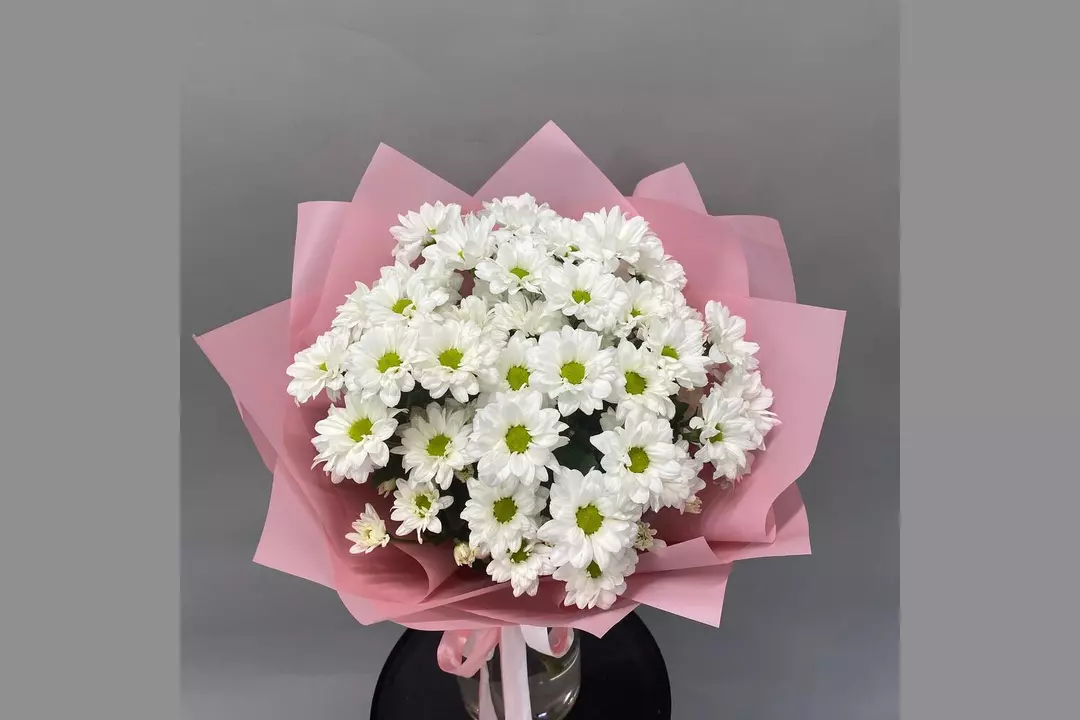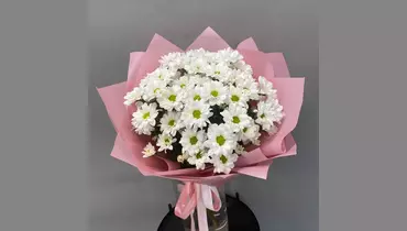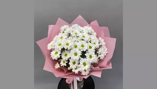 Воздушный букет из белой кустовой хризантемы в нежной упаковке. Он станет прекрасным подарком на день рождения, годовщину, свадьбу или просто чтобы порадовать близкого человека без повода.