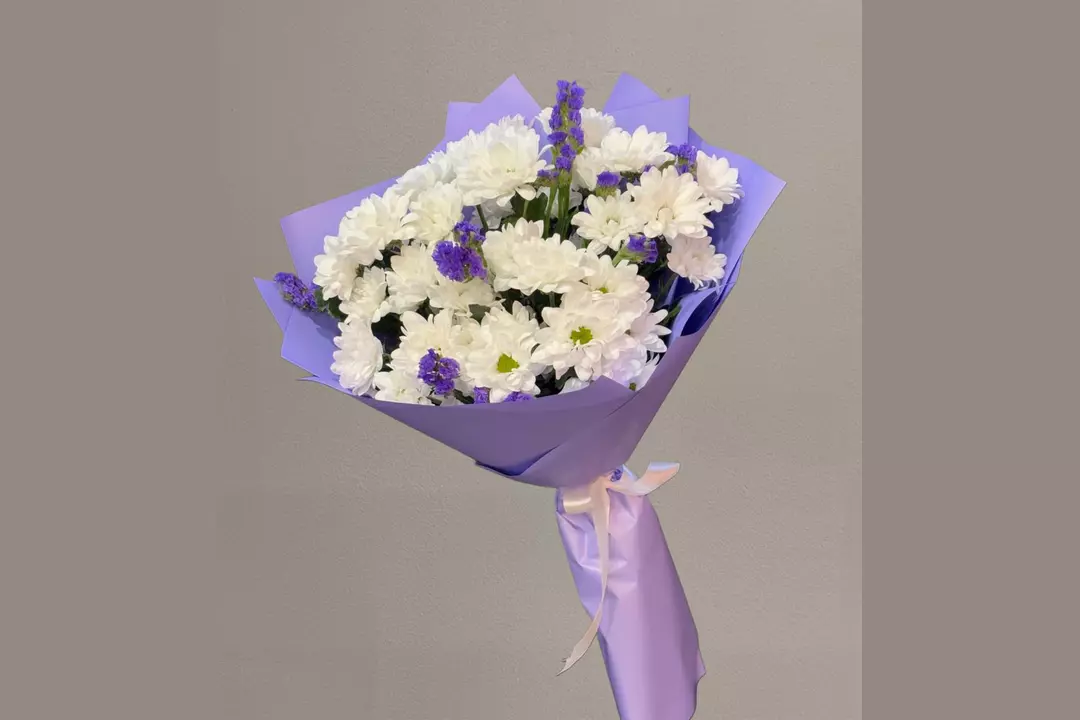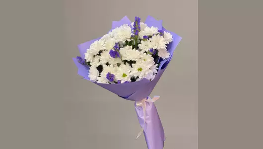 Букет белых хризантем и фиолетовой статицы. Состав - хризантема кустовая 5 шт. Статица 2 шт. Упаковка 1 шт