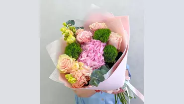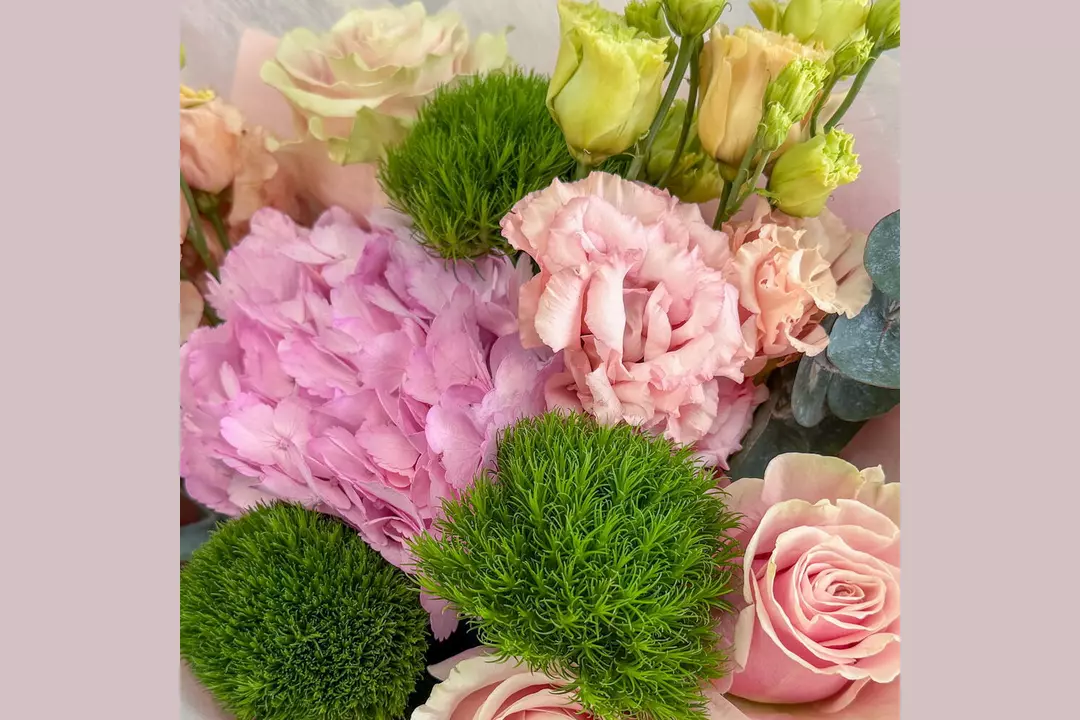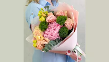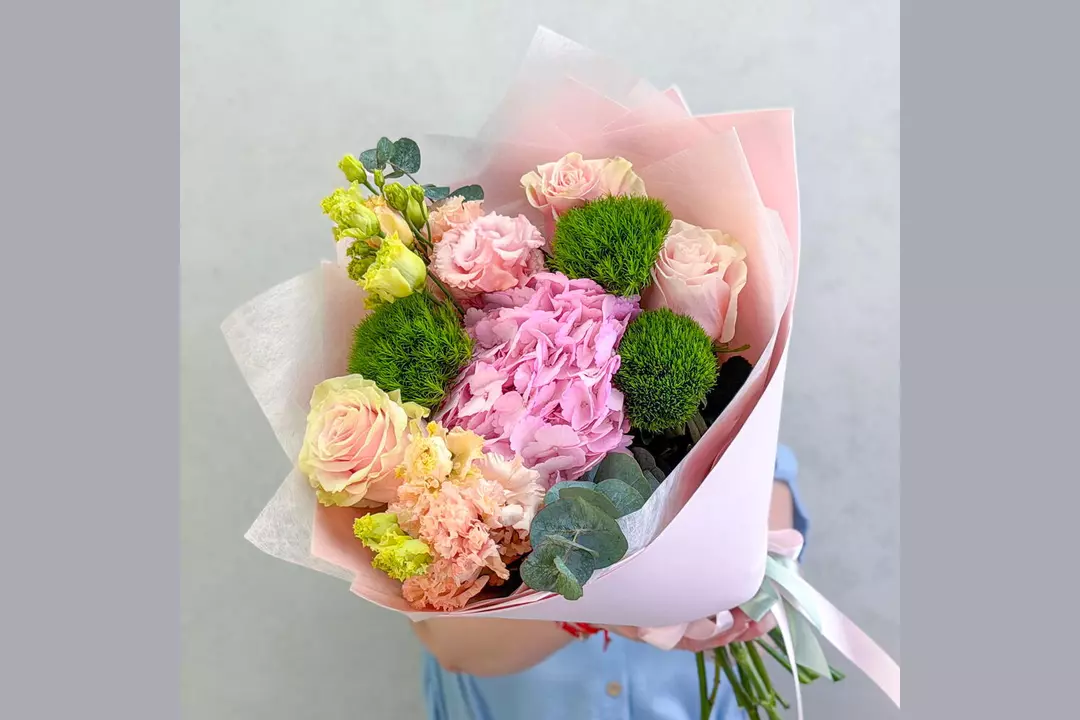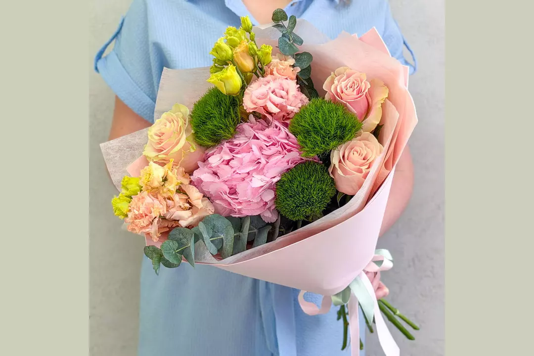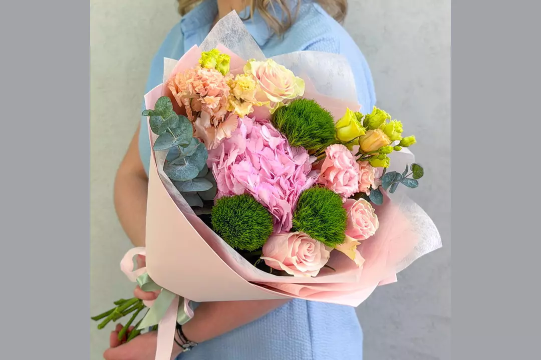 🩷Букет-комплимент с гортензией. Этот букет — воплощение утончённой нежности и спокойной элегантности. Интересная палитра розовых, персиковых и зеленых оттенков создаёт ощущение тепла, заботы и искренних чувств. Розовые розы, необычные гвоздики киви, персиковая эустома, розовая гортензия и ароматная зелень эвкалипта собраны в гармоничную композицию, которая выглядит безупречно. Букет идеально подойдёт для тех моментов, когда хочется сказать «я рядом», «ты важна» или «я думаю о тебе»-без лишних слов, но с искренним чувством. Гортензия очень влаголюбивый цветок. Чем больше воды будет в вазе, тем лучше для цветов. Состав: Гортензия - 1 шт. Роза Эквадор - 3 шт. Эустома - 2 шт. Лента атласная - 2 шт. Упаковка дизайнерская - 1 шт. Эвкалипт Цинерея - 1 шт. гвоздика киви - 3 шт.