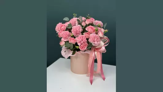 Шляпная коробка с пионовидной розой и Диантусом в нежно коралловом оттенке