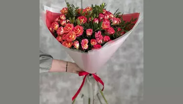 Яркий букет из 7 кустовых красно-желтых роз и 3 веточек сочно-зеленой фисташки в стильной дизайнерской упаковке. Состав: Роза кустовая - 7 шт. Лента атласная - 2 шт. Упаковка дизайнерская - 1 шт.