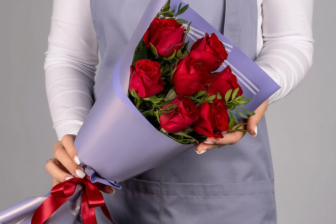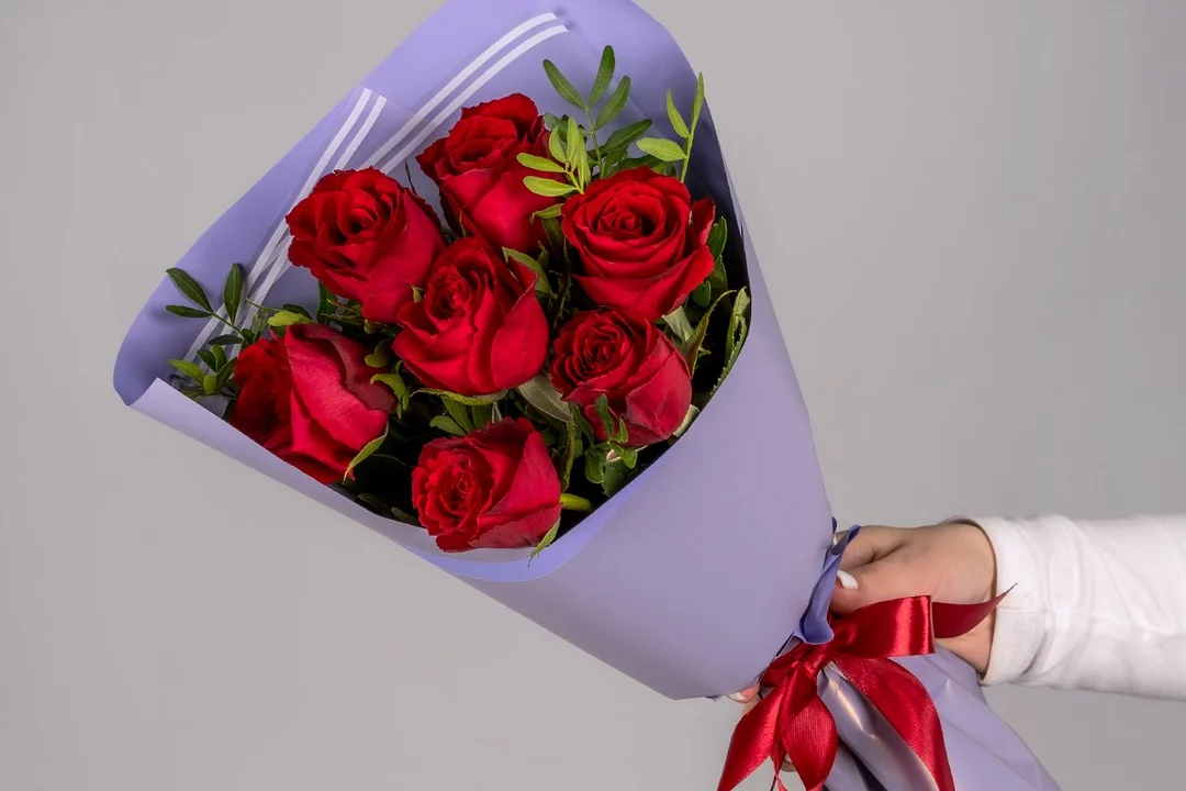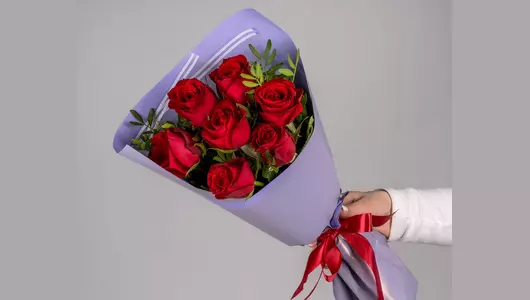 Состав: роза кенийская - 7 шт, зелень фисташки - 2 шт, пленка - 2шт, лента - 1 шт