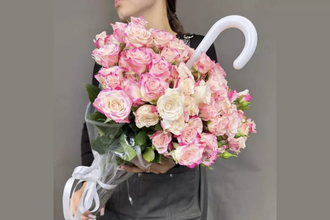 Букет кустовых роз в зонтике Состав: роза кустова - 29 шт, зонт прозрачный - 1 шт, лента 1 шт