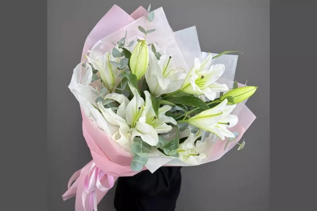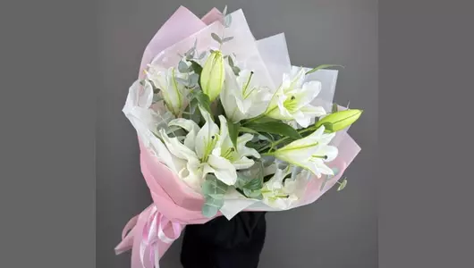 Букет лилия с эвкалиптом Состав: Лилия белая - 3 шт, эвкалипт - 2 шт, упаковка - 5 шт, лента - 2 шт.