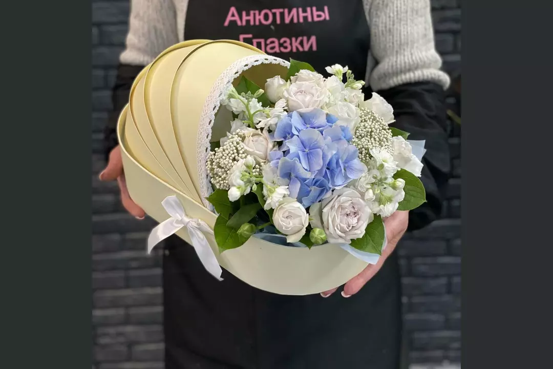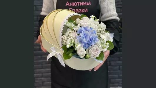 Букет на выписку из роддома выполнен в нежных оттенках гортензии и розы, дополненной маттиолой. Это сочетание символизирует новую жизнь, чистоту и нежность, что делает их идеальным подарком для молодой мамы и ее малыша. Букет представлен в изящной люльке, которая придает ему особую изящность, легкость и тематичность момента. Такой жест позволит запомнить этот важный день на всю жизнь. Для того чтобы сделать этот день еще более приятным, можно дополнить букет шоколадом или конфетами, а также добавить карточку с пожеланиями и теплыми словами. Такой незабываемый подарок точно принесет улыбку на лицо молодой мамы и наполнит ее сердце радостью и теплотой.