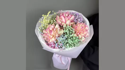Букет нежных роз и радужной гипсофилы Состав: роза французская - 3, гипсофила радужная 4 шт, упаковка - 2 шт, лента - 1 шт.