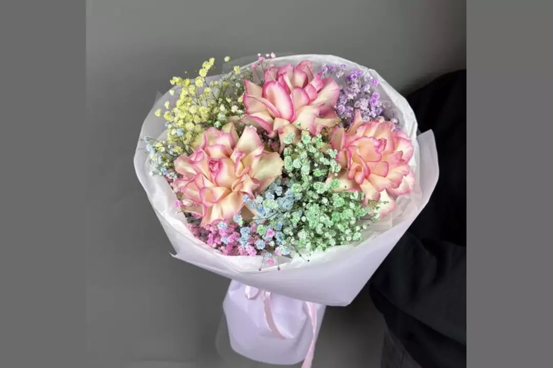 Букет нежнвх роз и радужной гипсофилы FMART by flowwow