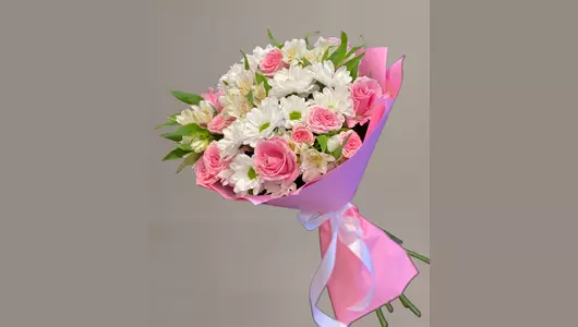 Нежный букет из роз, альстромерий и хризантем. состав- альстромерия 4 шт, хризантема кустовая 3 шт, роза 3 шт, упаковка 1 шт