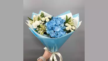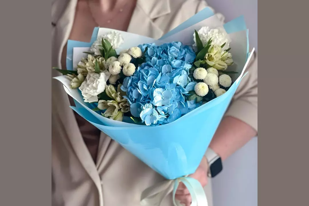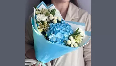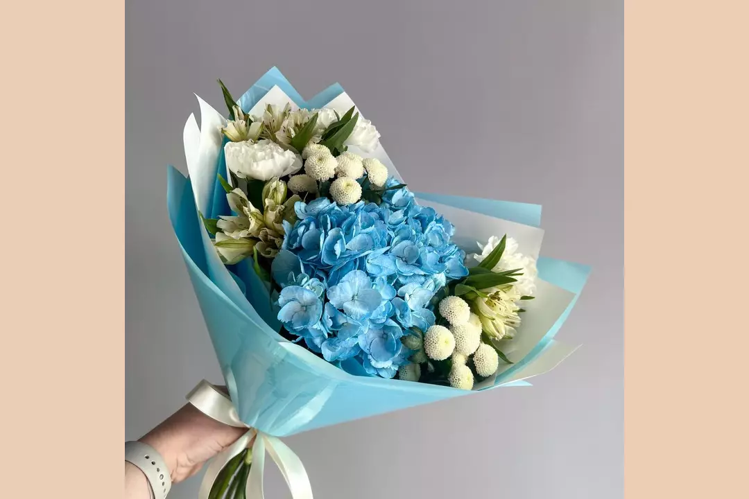 Альстромерия, хризантема Сантини и Гортензия собранные в нежный букет будут приятным подарком для жены, подруги, девушки, мамы, бабушки, для коллеги или дочки. Состав букета: Альстромерия - 3 шт. Гортензия - 1 шт. Диантус - 3 шт. Сантини - 2 шт. Упаковка дизайнерская - 1 шт Размеры: Ширина - 27 см Высота - 50 см