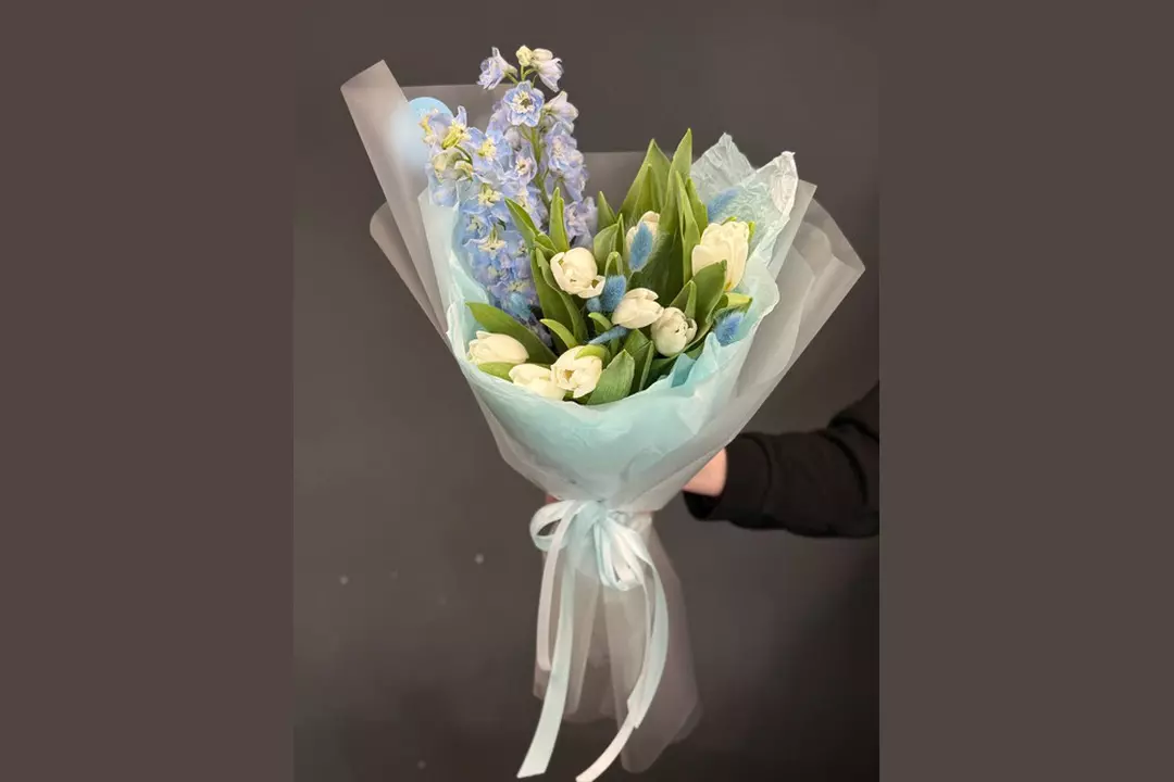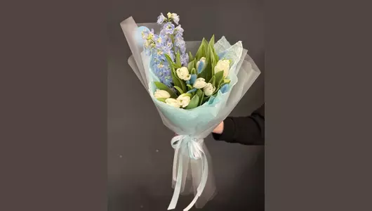 Этот букет — истинное воплощение весенней лёгкости и нежности. В его композиции гармонично сочетаются белоснежные тюльпаны, словно только что пробудившиеся ото сна, и изящные соцветия дельфиниума небесно-голубого оттенка