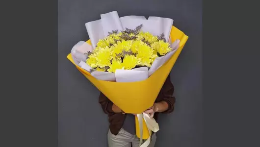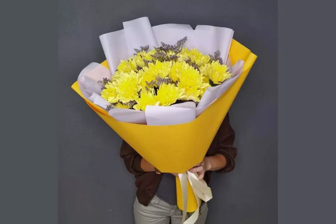 Состав: Лимониум -3 Хризантема кустовая - 5 Упаковка -1 Инструкция по уходу за букетом: 🌿Обновите срез острым ножом или секатором под углом. 🌿Вода должна быть холодной. 🌿Воды 2/3 вазы. 🌿Каждый день меняйте воду и обновляете срез. 🌿Не ставьте цветы у батареи и отопительных приборов, на прямые солнечные лучи и сквозняки, на кухню около фруктов. Чем прохладнее место, тем они дольше вас будут радовать! 🌿Температура не выше 15 градусов. Мы учитываем ваши пожелания, а также можем добавить к букету фирменную открытку с вашим посланием 💌 ✨ Наша цель - дарить людям радость и незабываемые впечатления! Чтобы нас было легче найти, добавляйте наш товар и магазин в избранное ⭐️