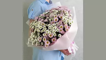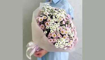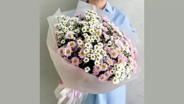 Букет-облако малюток ромашек микс. Очаровательный букет из 19 мини-хризантем Сантини белого и розового цвета в стильной дизайнерской упаковке. Состав: Лента атласная - 2 шт. Сантини - 19 шт. Упаковка дизайнерская - 1 шт.
