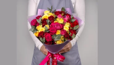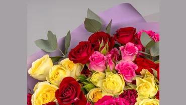 Состав: роза куст. Кения 40 см микс 15 шт., эвкалипт 0,4 шт., пленка 2 шт., лента 1 шт.