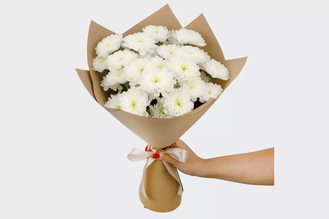Монобукет из белой хризантемы олицетворяет безусловную нежность, спокойное и постоянное чувство, которое греет изнутри. Этот букет без слов говорит о заботе, внимании и глубокой любви. Идеален для особых случаев, но также и просто — без повода.