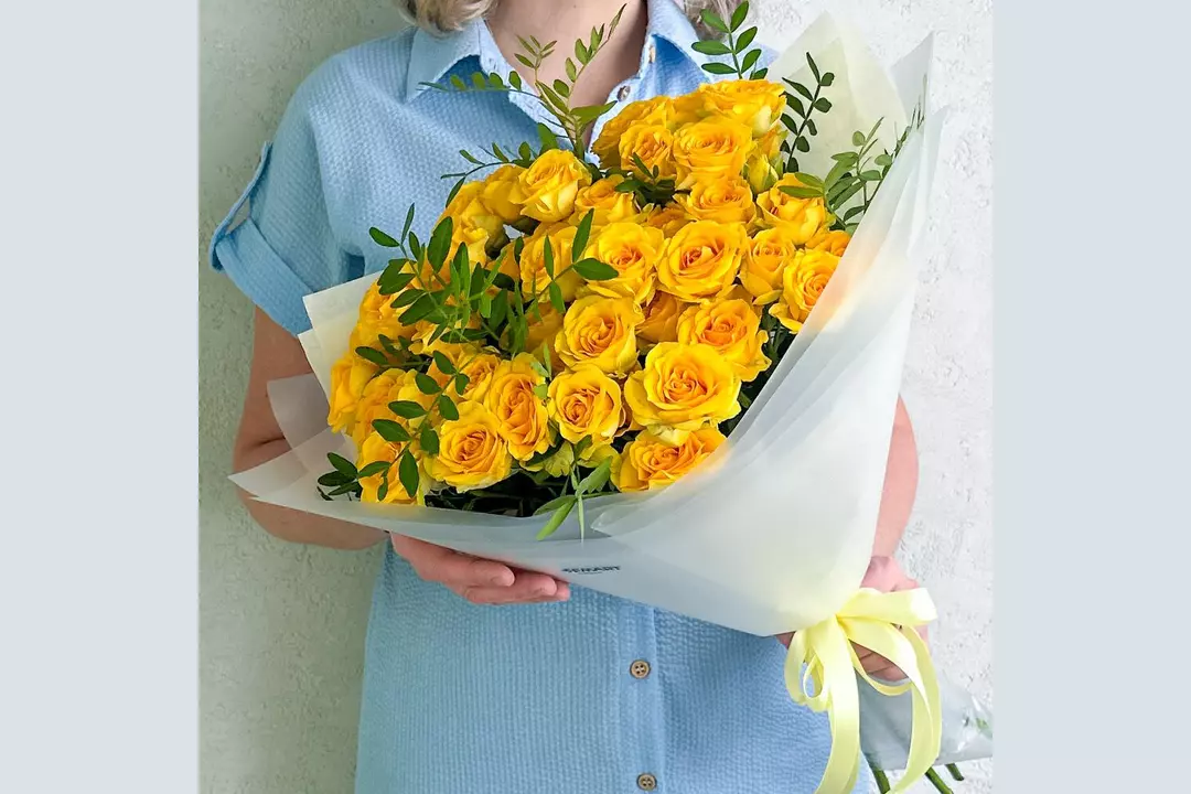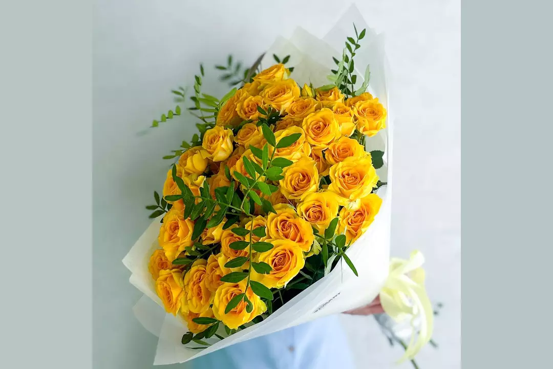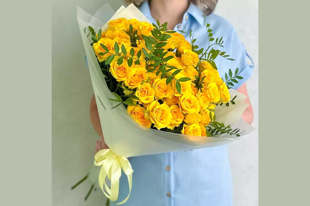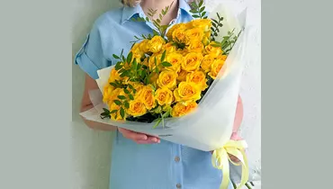 Состав Роза кустовая - 7 шт. Лента атласная - 2 шт. Фисташка - 2 шт. Упаковка дизайнерская - 1 шт.
