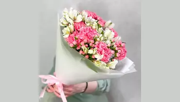 Нежный букет из белых альстромерий, коралловых гвоздик, розовых ягод гиперикума в стильной дизайнерской упаковке. Состав: Альстромерия - 6 шт. Гиперикум - 4 шт. Гвоздика - 9 шт. Лента атласная - 2 шт. Упаковка дизайнерская - 1 шт.