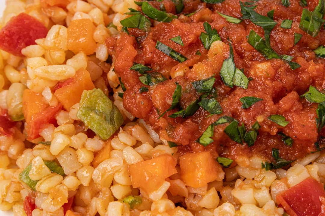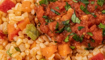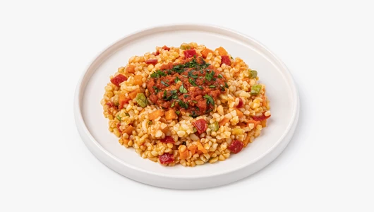Булгур с томатами, кабачками и сладким перцем. Обладает насыщенным овощным вкусом с лёгкими пикантными нотками. Рекомендуем подавать в качестве гарнира к основному блюду или холодной закуски.