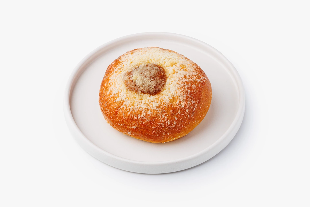 Пышная пшеничная булочка на кефире с ванилью, выпеченная по домашнему рецепту. В серединке начинка из яблочного джема. Сверху выпечка посыпана традиционной сладкой крошкой.
