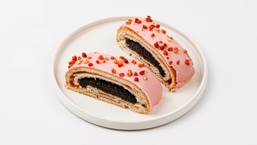 Глазированная булочка с щедрой маковой начинкой и слоем клубничного конфитюра. Нежное сдобное тесто с маслянистыми нотками подчёркивает насыщенный, чуть ореховый вкус мака, а клубника добавляет приятную ягодную кислинку. Сверху — розовая глазурь с ванильным оттенком и крошкой сублимированной клубники. Особенно хороша с чаем или кофе, можно чуть подогреть, чтобы раскрыть аромат и сделать булочку ещё мягче.