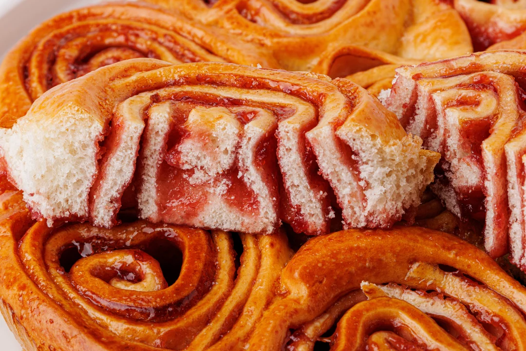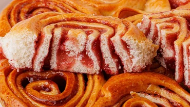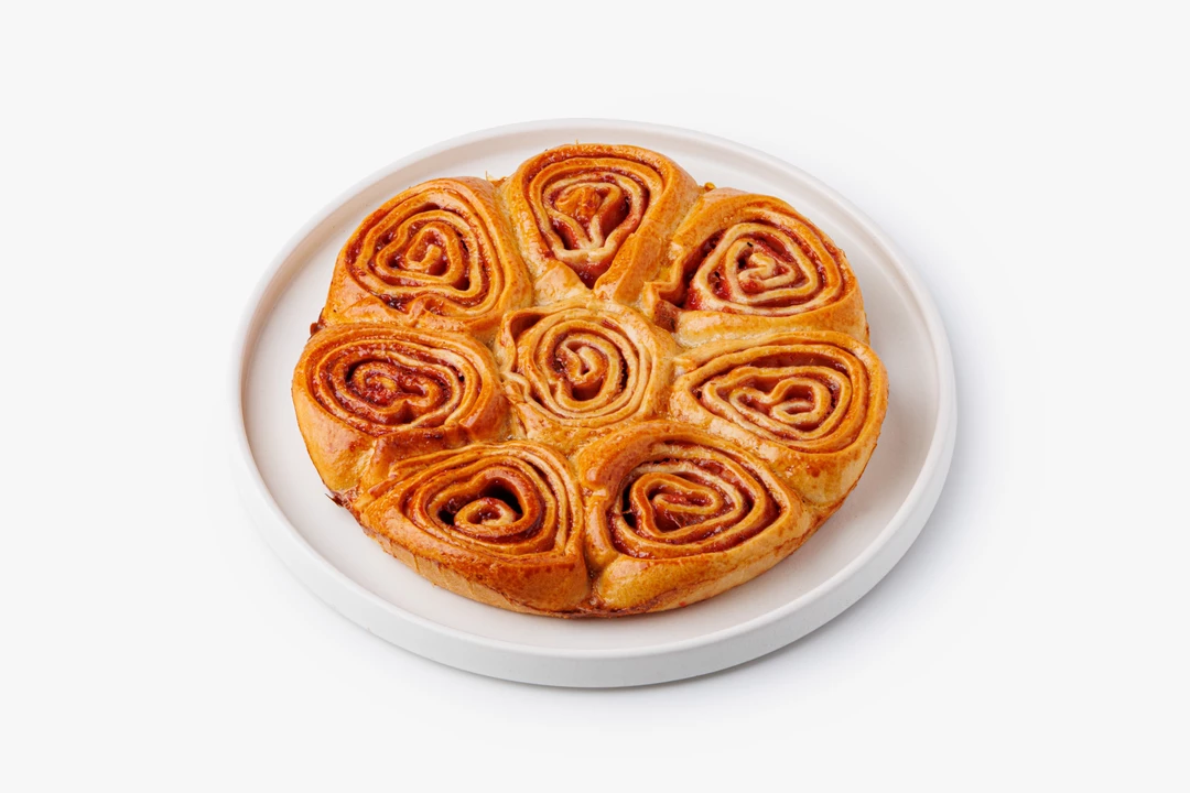 Большая «ромашка» из булочек с вишнёвой начинкой. Выпечена из пшеничной муки высшего сорта на сливочном масле и молоке.
