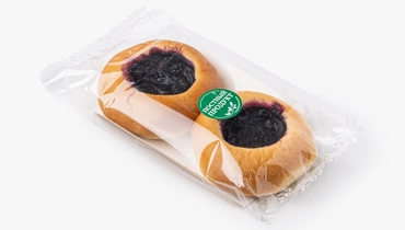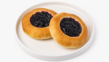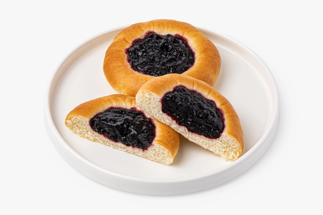 Круглые булочки из дрожжевого теста с черничной начинкой. Тесто приготовлено на растительном масле. В составе нет ингредиентов животного происхождения. В упаковке 2 штуки