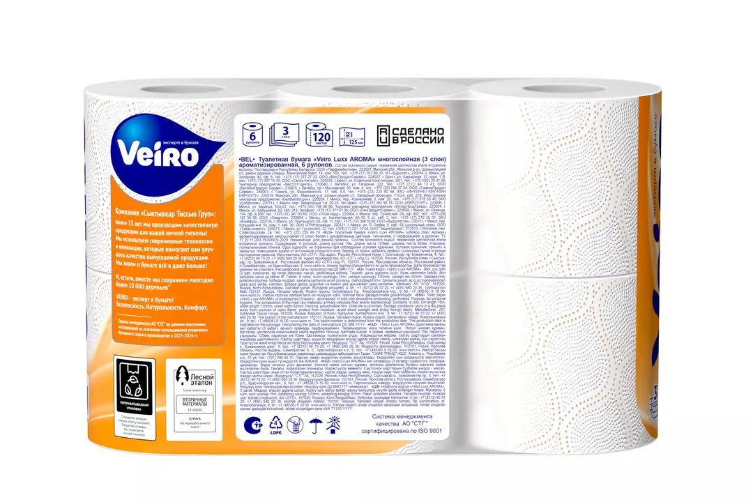 Тип продукта: туалетная бумага Вид: рулонный Количество слоев: 3 Серия: Luxoria Кол-во листов в рулоне: 120 Количество рулонов: 6 Длина рулона-15м Наличие втулки: да Рисунок тиснения-цветок Размер листа: 12,5 х 9,2 см Цвет бумаги: оранжевый Особенности: с перфорацией Тип сырья: целлюлоза Срок годности: не ограничен Упаковка: пакет Размер упаковки (ДхШхВ): 27.6 х 22 х 11см Вес товара с упаковкой: 402 гр Бренд: Veiro Страна бренда: Россия
