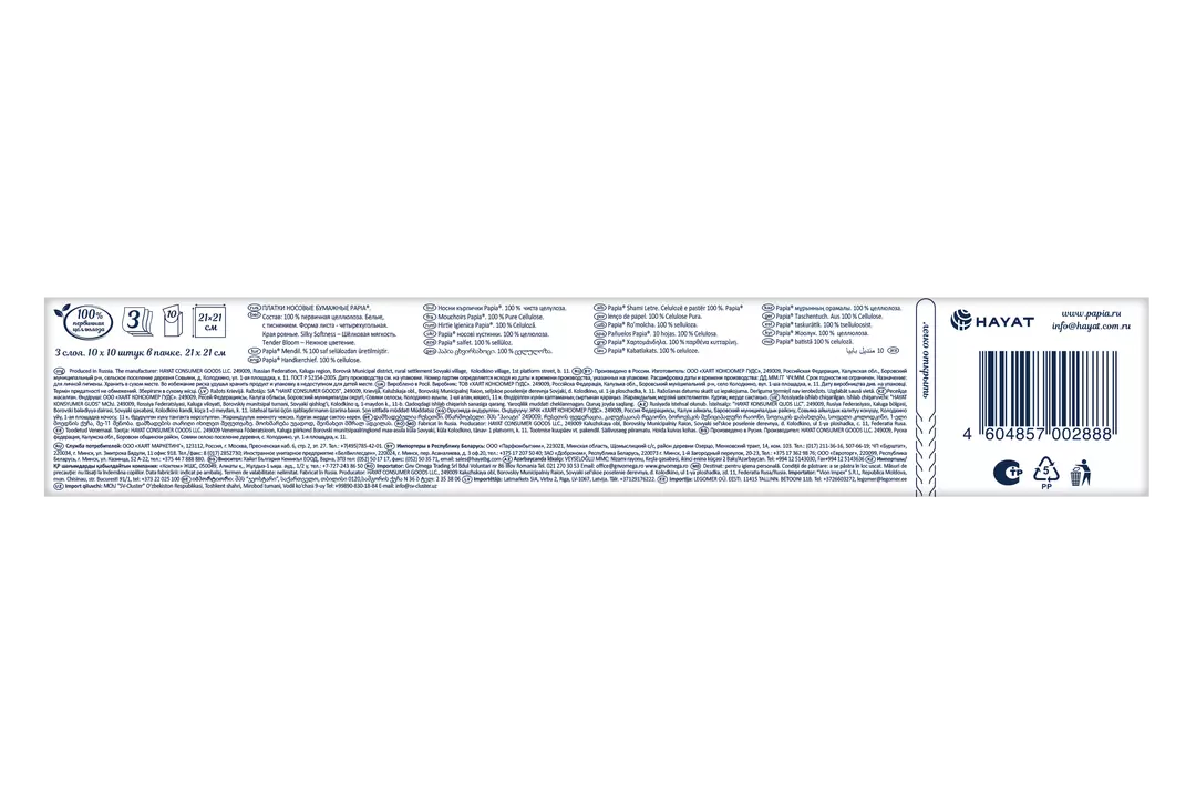 Бумажные носовые платочки Papia – это необходимое средство для заботы о вашей коже. Мягкие трехслойные платочки изготовлены из высококачественной 100% первичной целлюлозы. Носовые платочки Papia станут незаменимым атрибутом особенно в период простуд и аллергий, поскольку надежно защищают от раздражений, гарантируя максимальный комфорт и мягкость при использовании. Обладают приятным цветочным ароматом. В упаковке 10 штук по 10 платочков размером 21х21 см. Страна-производитель Россия