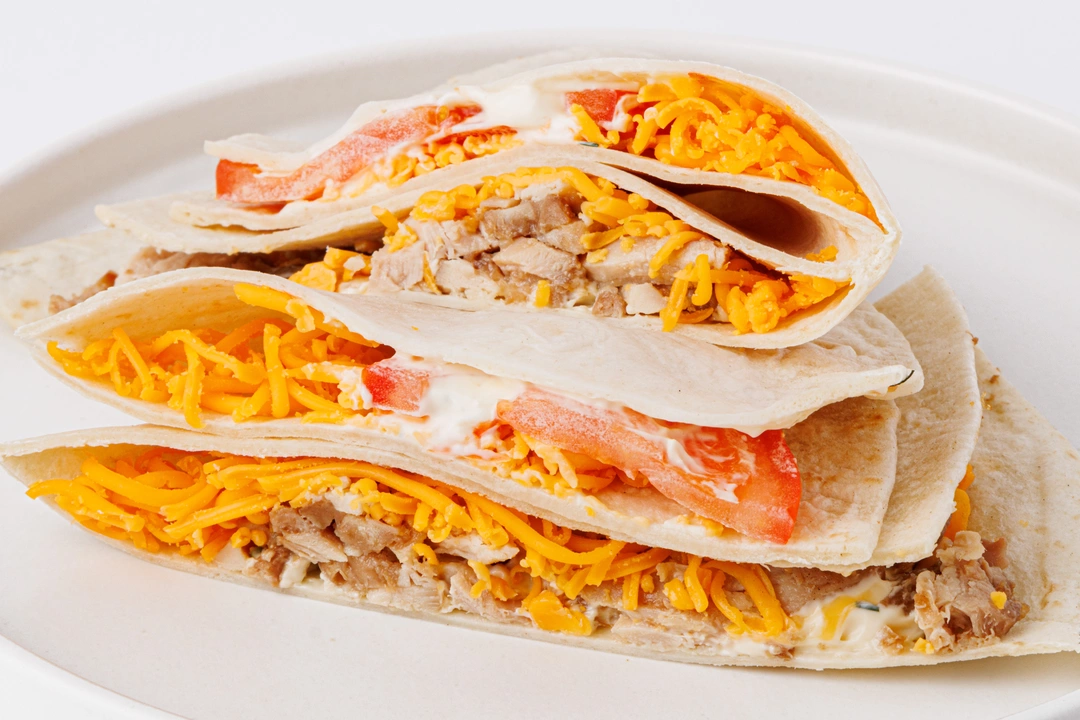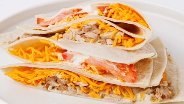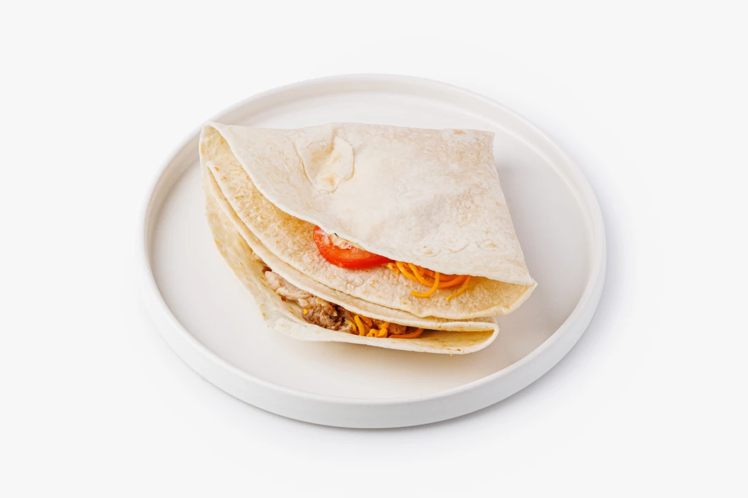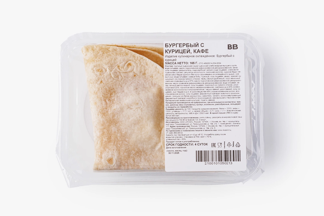 тортилья пшеничная (мука пшеничная хлебопекарная высшего сорта, вода питьевая, масло подсолнечное рафинированное дезодорированное, сахар, соль пищевая, разрыхлитель -гидрокарбонат натрия (сода пищевая), клейковина пшеничная (глютен), регулятор кислотности- лимонная кислота), куриное бедро жареное (мясо бедра куриного без кости (произведено из охлаждённого сырья), соевый соус (вода питьевая, соевые бобы, пшеница, соль пищевая, сахар), крахмал кукурузный, сок лимона прямого отжима, перец черный дробленый), соус чесночный (майонез оливковый м.д.ж 67% (масло подсолнечное рафинированное дезодорированное, масло оливковое рафинированное дезодорированное, вода питьевая, сахар, яичный желток жидкий, соль пищевая, лимонный сок прямого отжима, уксус спиртовой 20%, горчичное масло нерафинированное), сметана м.д.ж 20% (сливки, закваска молочнокислых микроорганизмов), чеснок свежий, укроп свежий, соль пищевая), сыр Чеддер м.д.ж. в сухом веществе 45% (нормализованное молоко, восстановленное молоко, соль пищевая, ферментный препарат животного происхождения- лизоцим (из белка куриных яиц), краситель- аннато, молокосвёртывающий ферментный препарат микробного происхождения, мезофильная и термофильная бактериальная заквасочная культура), томаты свежие. Продукция производится на предприятии, где используются аллергены: арахис, диоксид серы (сульфиты), кунжут, моллюски, ракообразные, рыба, орехи, сельдерей.