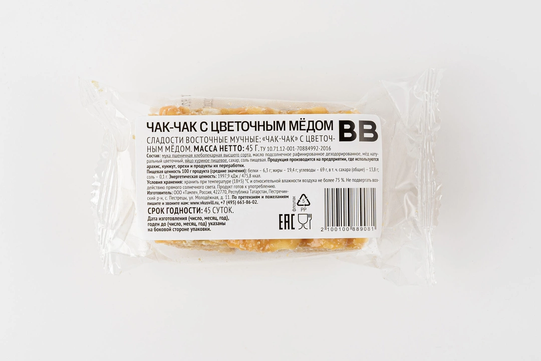 Мягкая восточная сладость на цветочном меду. Попробовав чак-чак единожды, вы непременно захотите вернуться к нему вновь. Лакомство обладает плотной текстурой и сладко-сливочным вкусом с выразительной медовой нотой. Благодаря порционному формату чак-чак удобно взять с собой, чтобы полакомиться им на работе или в дороге.