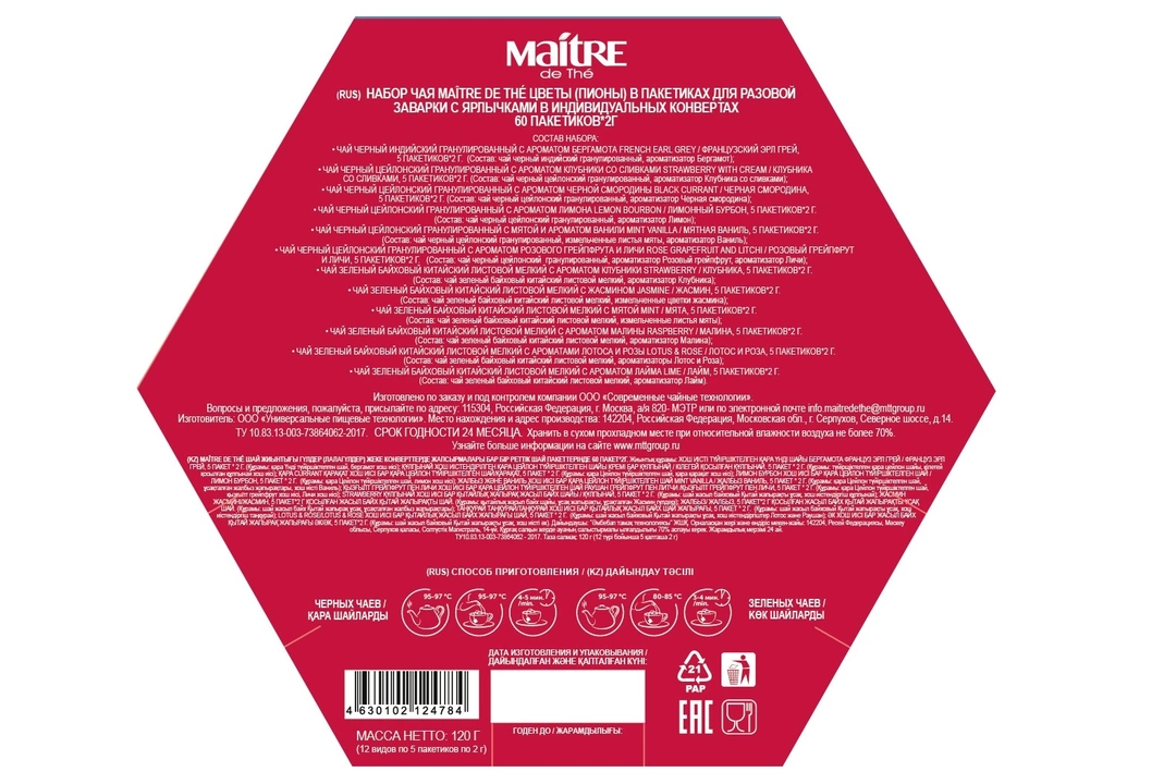 MAÎTRE de Thé Набор чая Букет Пионы в пакетиках для разовой заварки с ярлычками в индивидуальных конвертах, 60*2Г. Это чай для любого настроения, любой ситуации и любой компании. Это прекрасное решение для презента коллегам, друзьм и близким. Это подарок, который создаст праздничное настроение. В наборе чая MAITRE de Thé ЦВЕТЫ двенадцать специально подобранных вкусов и ароматов - каждый найдет для себя свой любимый чай MAITRE de Thé: ФРАНЦУЗСКИЙ ЭРЛ ГРЕЙ - черный чай с легким ароматом бергамота,чай, восстанавливающий силы во время краткого отдыха; КЛУБНИКА СО СЛИВКАМИ – любимое сочетание черного ароматного чая с клубникой и сливками; ЧЕРНАЯ СМОРОДИНА - черный чай с традиционным вкусом и ароматом черной смородины; ЛИМОННЫЙ БУРБОН – традиционный черный чай с любимым вкусом и ароматом лимона, чай пробуждающий силу и энергию; МЯТНАЯ ВАНИЛЬ – крепкий черный чай с натуральной мятой и нежным вкусом ванили; КЛУБНИКА - зеленый чай с приятным фруктовым послевкусием и ароматом летней клубники; РОЗОВЫЙ ГРЕЙПФРУТ И ЛИЧИ -черный чай с легкой кислинкой грейпфрута зарядит энергией и удивит прекрасным послевкусием; ЖАСМИН - зеленый чай с тонким, элегантным характерно цветочным вкусом и легким воздушным ароматом, 100% натуральный продукт; МЯТА - зеленый чай с приятным мятным послевкусием, 100% натуральный продукт; МАЛИНА - зеленый чай со сладким ароматом малины подарит воспоминание о лете в любое время года; ЛОТОСА И РОЗЫ - зеленый чай с добавлением лотоса и тонкого аромата розы не оставят никого равнодушным; ЛАЙМ - зеленый чай с терпким ароматом лайма и приятным фруктовым послевкусием, будет хорошим дополнением к обеденной трапезе.Приятного чаепития! Ваш чайный сомелье MAÎTRE de Thé.