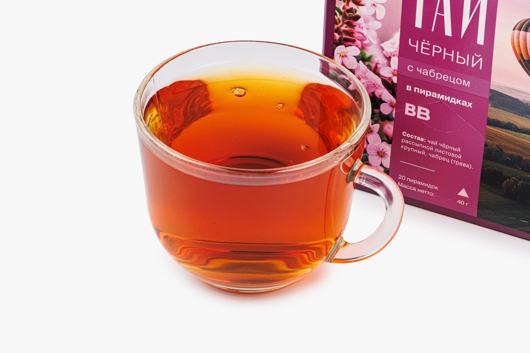 Ароматный чёрный чай с натуральным чабрецом. Тонкий пряный привкус и освежающее послевкусие. Крепкий настой красноватого оттенка. Этот полезный чай бодрит, придаёт сил и отлично утоляет жажду. Вкусен с молоком и мёдом. Способ приготовления: Положите один фильтр-пакет в чашку и залейте его горячей водой. Дайте настояться 3–5 минут. В упаковке 20 пакетиков