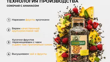 Зеленый чай обогащен нежным ананасом, дарящим сладкие тропические нотки. Сочетание с малиной добавляет яркой кислинки и ароматных нюансов, а мята придает напитку мягкость и свежесть вкуса. beFRUITbe - гармония вкуса и пользы, созданная без использования искусственных ароматизаторов и красителей. Малина - известный источник витаминов и антиоксидантов.Чай beFRUITbe с ананасом, малиной и мятой не только вкусный, но и полезный, помогает поддерживать ваш иммунитет. Подходит как для утреннего бодрящего начала дня, так и для вечернего расслабления. Превосходно сочетается с легкими закусками и десертами. Сокочай произведен во Вьетнаме, купажирование и фасовка в России. Способ заваривания: 2 столовые ложки без горки (10гр) на 600мл кипятка Страна-производитель Россия
