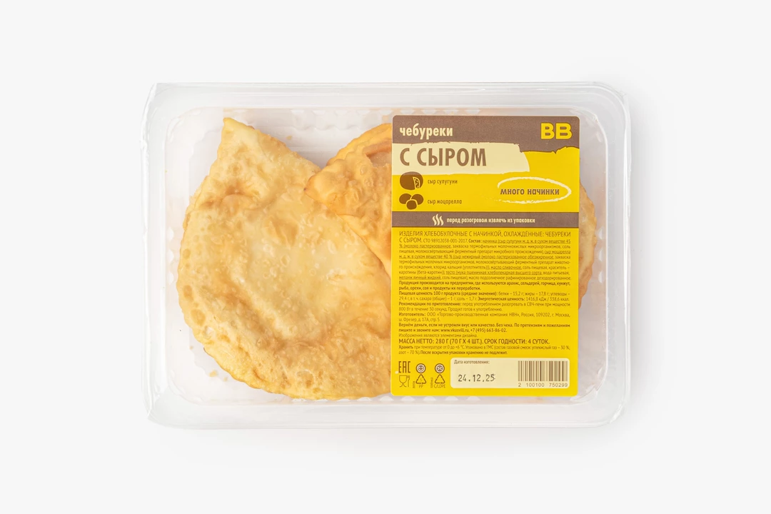 Тонкое золотистое тесто и много начинки из сулугуни с моцареллой. Нежный сливочный вкус и ничего лишнего. Советуем немного разогреть — ведь чем тягучее сыр, тем аппетитнее. В упаковке 4 чебурека.