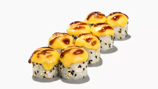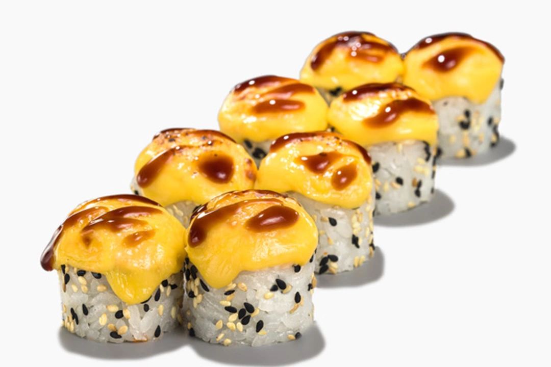 Аппетитное сочетание нежного лосося гриль с копчёными нотками и пикантного сыра чеддер. Свежее авокадо и икра масаго добавляют нежность, а фирменный соус яки с лёгкой остринкой подчеркивает вкус. Завершающий штрих — золотистый соус унаги и хрустящий кунжутный микс.