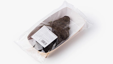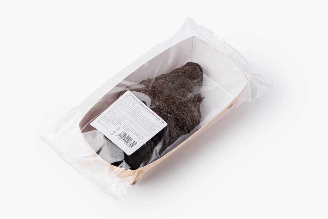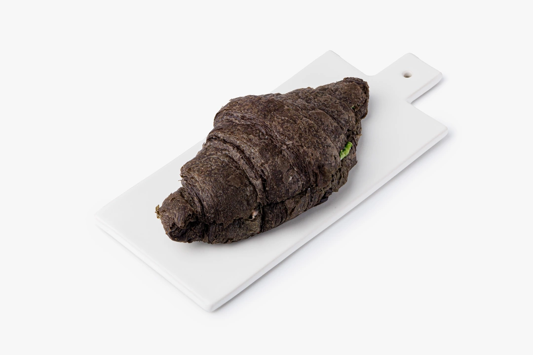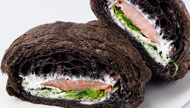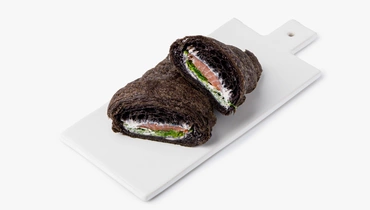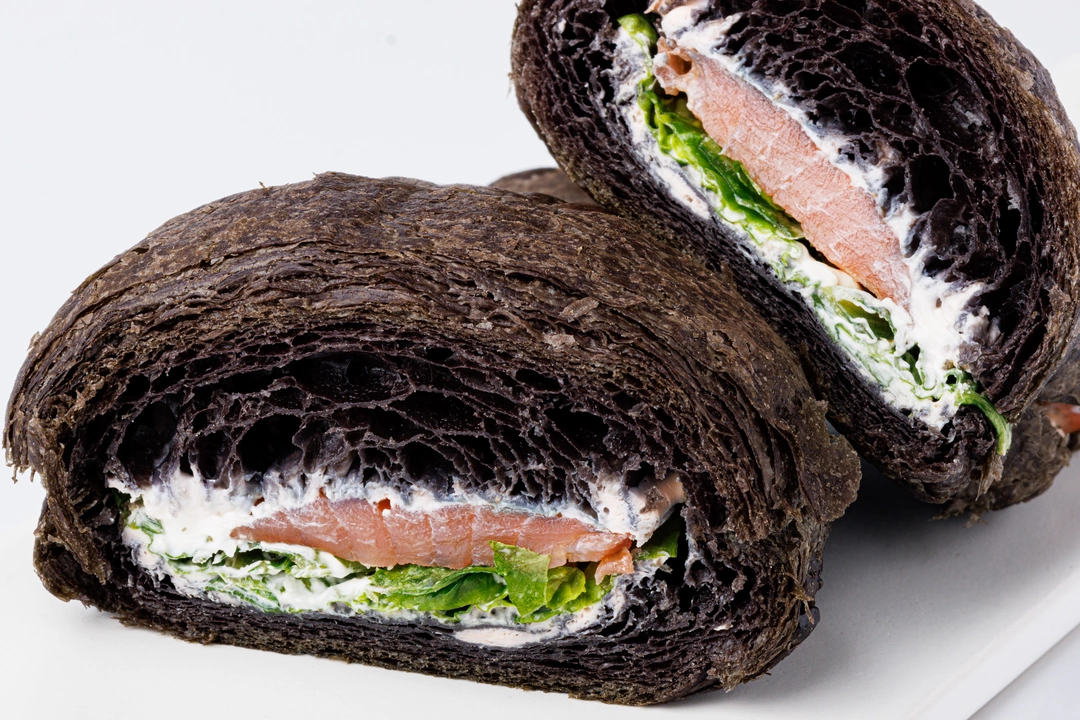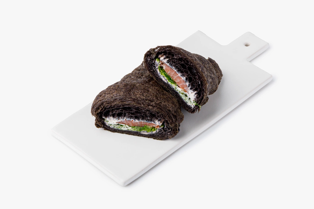Слоёный чёрный круассан с начинкой из слабосолёной форели, сливочного сыра и свежего салата романо. Тесто с добавлением активированного угля имеет графитовый цвет, который выгодно оттеняет нежную сливочность крем-чиза. Внутри — мягкие слои теста и рыбная начинка с тонким вкусом, дополненная свежестью листьев салата.