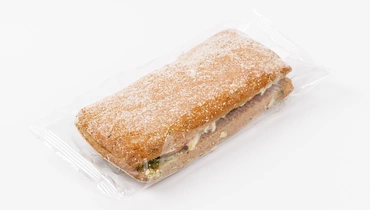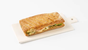 Запечённое филе индейки, свежие томаты и листья салата — лёгкое и питательное сочетание. Ароматный соус песто отлично дополняет вкус пикантными нотками. Ржаная чиабатта с льняными семечками соответствует вкусной и полезной начинке. Хлеб изготовлен из пшеничной муки высшего сорта в сочетании с ржаной обдирной мукой. Благодаря ржаному солоду, выпечка пышная, с сочным мякишем и насыщенным ароматом. Товар доступен в магазинах с зоной кафе.