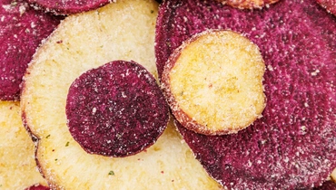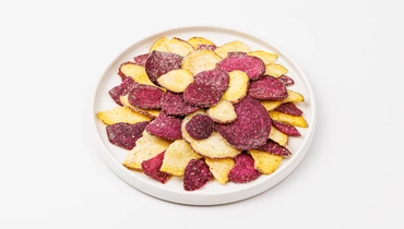 Хрустящие чипсы из красного и фиолетового батата с ярким вкусом соуса песто — это не только интересный перекус, но и способ попробовать что-то привычное в новом формате. Сладковатый вкус батата хорошо сочетается с пикантной сырной ноткой, базиликом, сушёным чесноком и лёгкой травяной свежестью. Текстура плотная и хрустящая, а разноцветные ломтики выглядят особенно аппетитно. Можно есть просто так или подать с соусом — в качестве закуски к основному блюду.