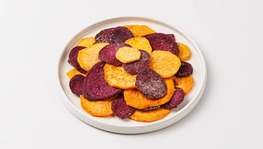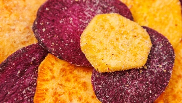 Ломтики из красного и фиолетового батата с лёгкой сладостью, сырными и грибными нотами — это необычный снек и повод попробовать что-то новое. Вкус получается многослойным: сначала чувствуется нежность батата, затем появляется солоноватый оттенок пармезана, а в конце остаётся трюфельное послевкусие. Чипсы можно есть просто так или подать с соусом к основному блюду, ими можно украсить холодные закуски или оригинальные салаты.