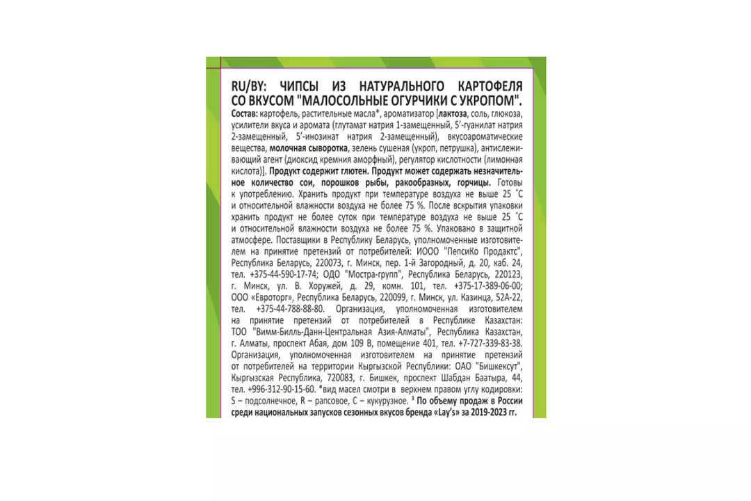 LAY'S® — чипсы, каждая пачка которых изготовлена из специально отобранного картофеля и соответствует самым высоким стандартам качества. Хрустящие и легкие на вкус картофельные чипсы LAY'S® были созданы, чтобы вызвать улыбку на лице каждого человека, поэтому ими так приятно делиться с лучшими друзьями. Чипсы LAY'S®, несомненно, скрасят ваш день! Страна производитель-Россия