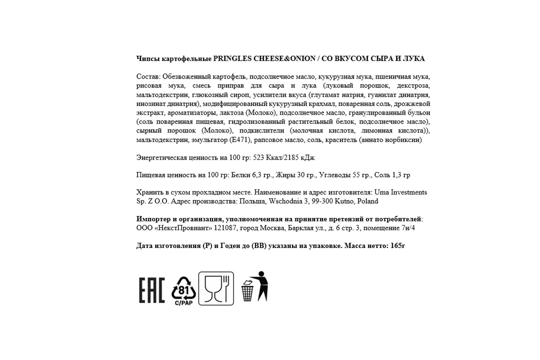 Чипсы Pringles со вкусом сыра и лука уже завоевали сердца миллионов потребителей. Ровные ломтики уникальной формы и одинакового размера упакованы в банку цилиндрической формы, которая позволяет добиться максимального уровня сохранности продукта при транспортировке. Идеально подходят для перекуса, а также добавления в салаты. Продукт удобно брать с собой в поездку, на прогулку, на работу или учебу. Страна производитель- Польша/Бельгия