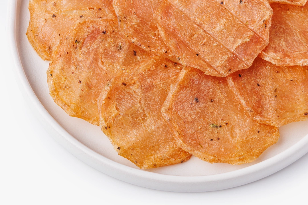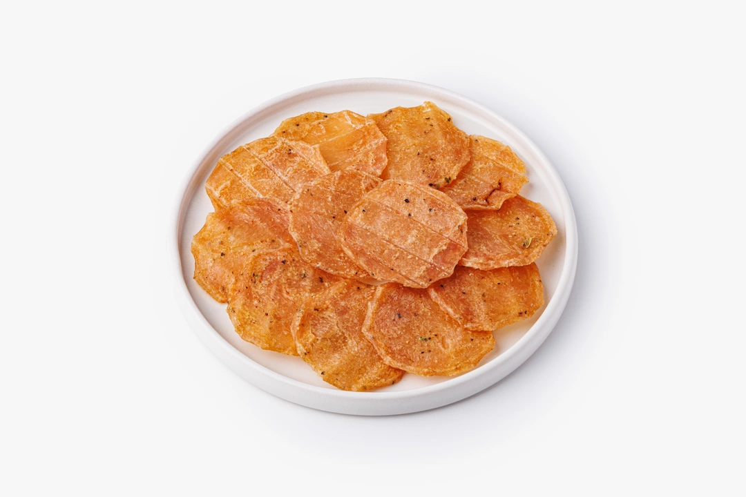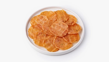 Сыровяленые куриные чипсы с ярким пикантным вкусом. Тонкие слайсы филе грудки получаются с лёгкой перечной остротой и выразительным акцентом паприки и чеснока. Благодаря особому способу вяления мясо остаётся плотным, но не пересушенным, с долгим послевкусием. А ещё это подходящий вариант для питательного перекуса: в одной пачке почти 26 г белка. На поверхности могут образоваться кристаллы соли — это естественный процесс, который не влияет на вкус и качество продукта.