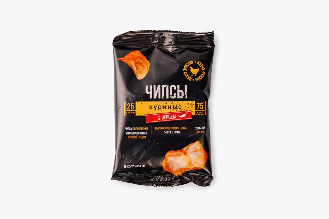Сыровяленые чипсы из отборного филе грудки. С долгоиграющей структурой и выразительной перчинкой в пряном вкусе. В одной пачке 14,67 г белка и всего 75 ккал. Удобный перекус при любых обстоятельствах. На поверхности могут образоваться кристаллы соли — это естественный процесс, он не влияет на вкус и качество продукта.